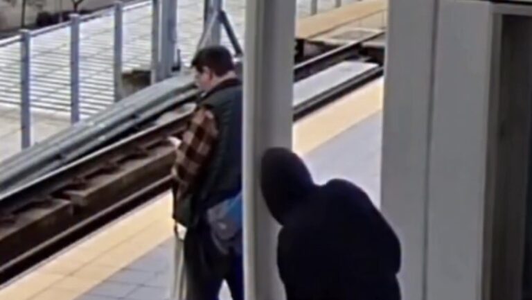 Uma câmera de segurança registrou o momento em que um homem tenta empurrar outro para os trilhos em uma estação…