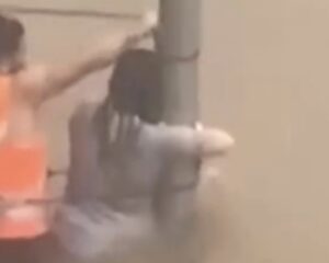 Mulher se agarra a poste para não ser levada por enxurrada durante temporal em Sorocaba